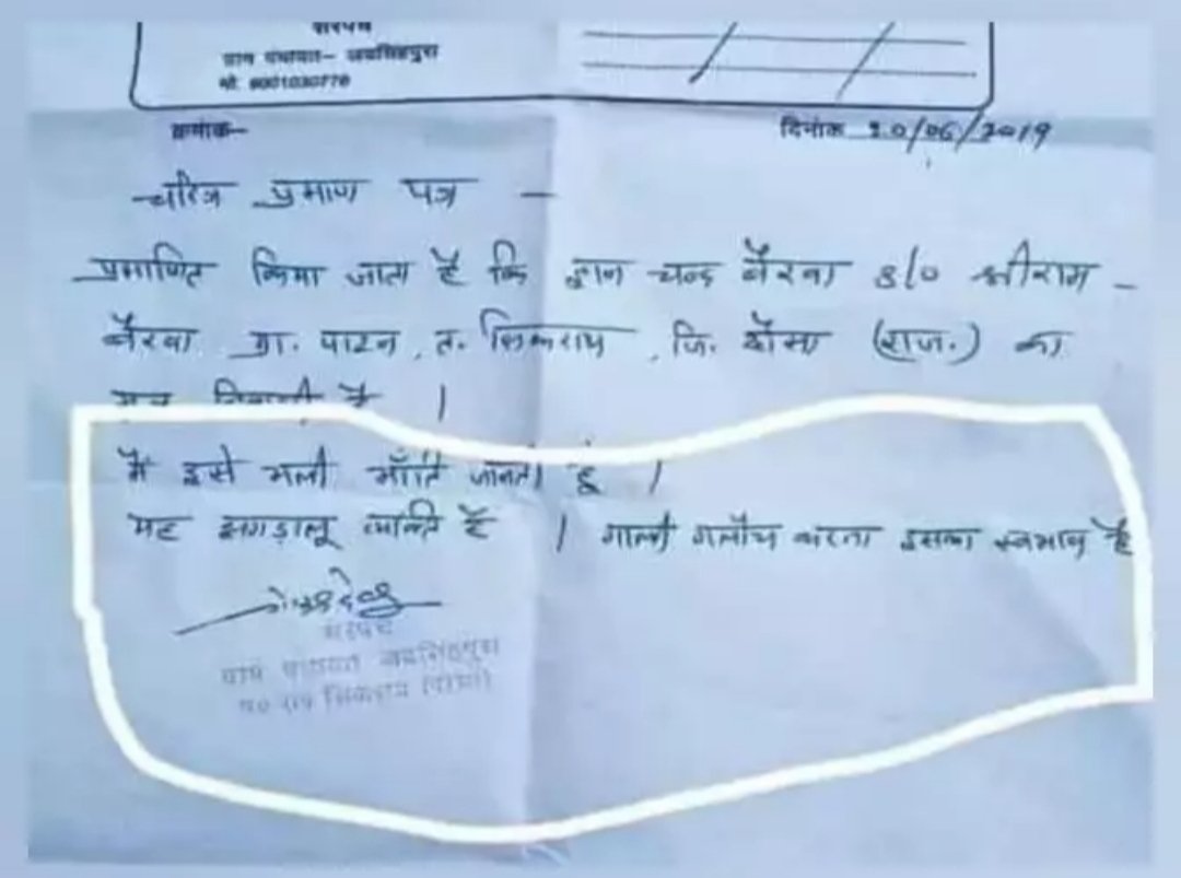 सोशल मीडिया पर एक चरित्र प्रमाण पत्र की तस्वीर वायरल हुई है जिसमें ‘मैं इसे भली भांति जानता हूं, यह झगड़ालू व्यक्ति है और गाली-गलौज करना इसका स्वभाव है’ लिखा हुआ है। इसमें सरपंच की मुहर व हस्ताक्षर भी हैं और इसमें तारीख 20 जुलाई 2019 लिखी हुई है। कई लोगों ने इस पर कहा कि सरपंच की पक्का इस व्यक्ति से दुश्मनी रही होगी।